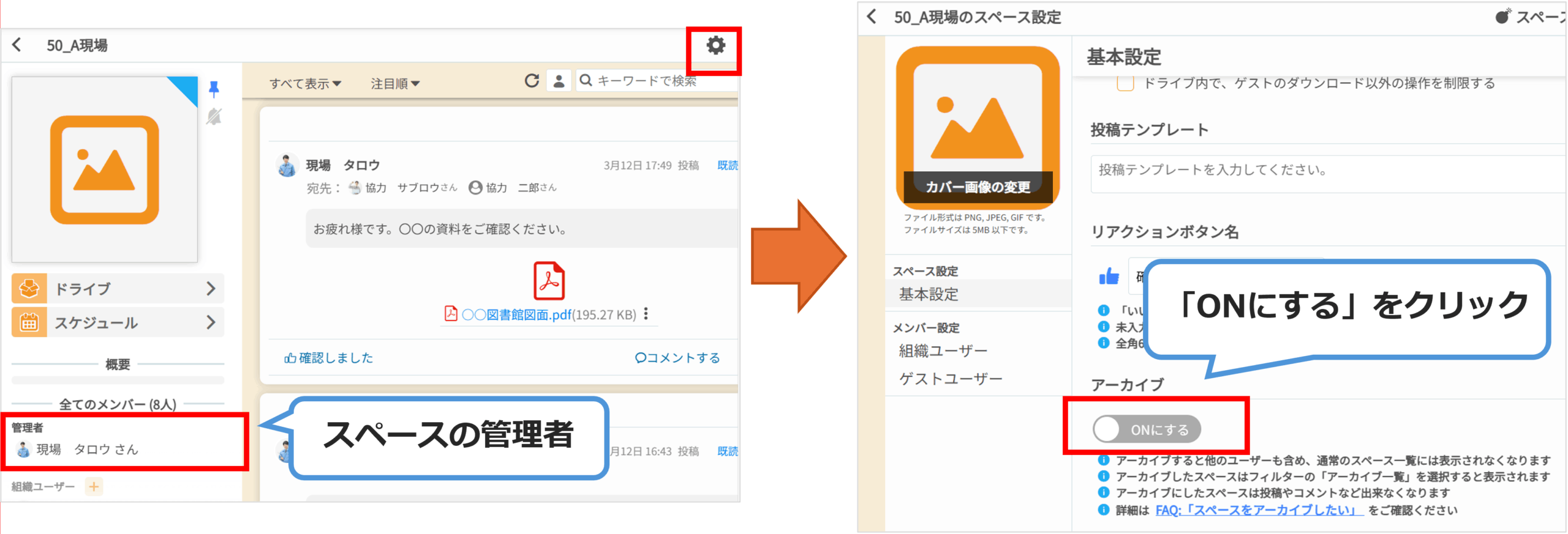 アーカイブ機能は、スペースの管理者のみ設定が可能です。