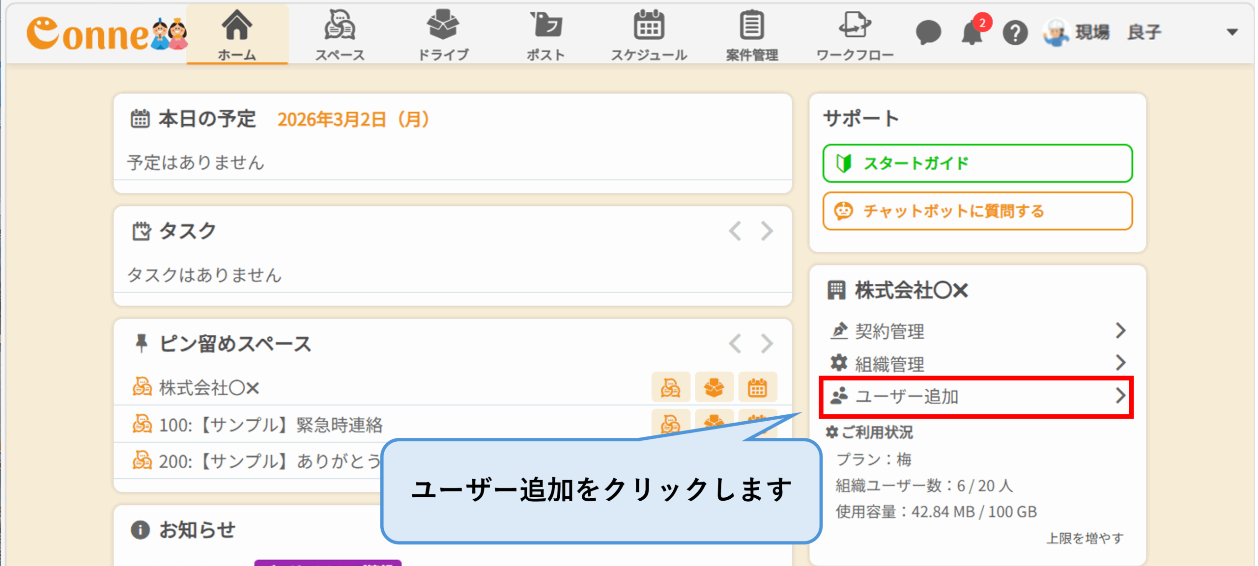 1.HOME画面右側「ユーザー追加」をクリックします。