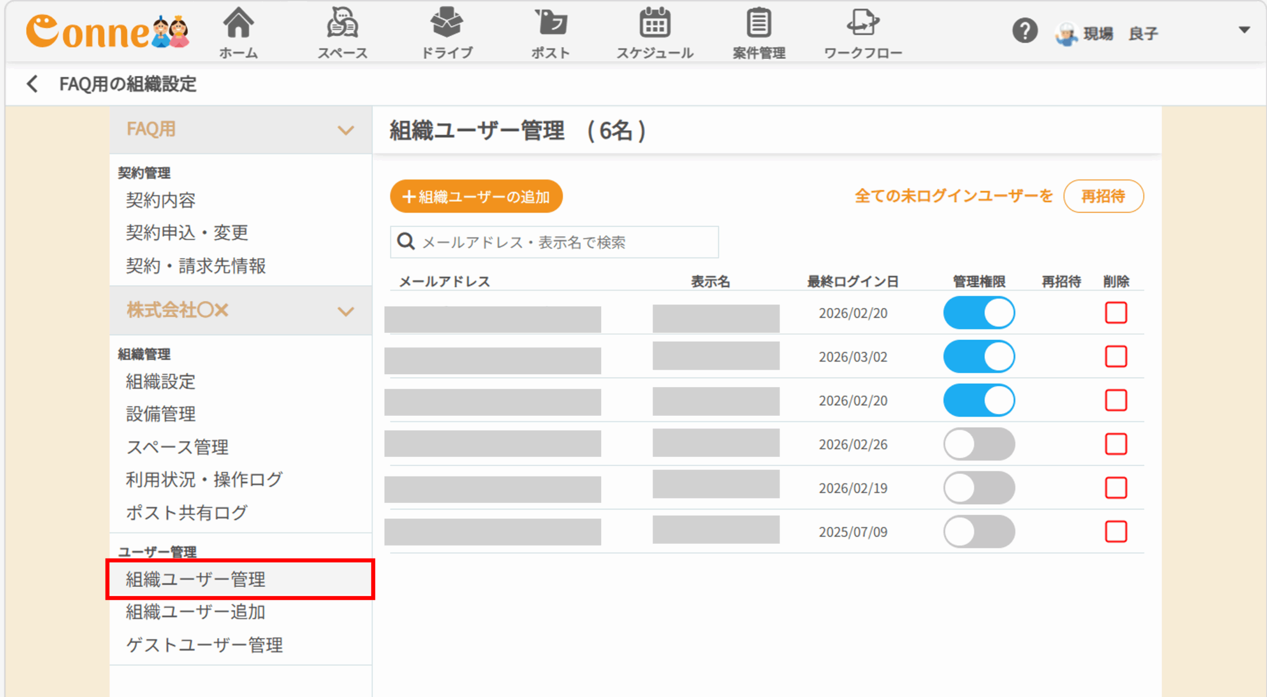 組織管理者にて、ユーザー管理より組織ユーザーを追加することができます。