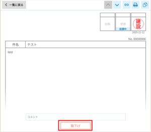 取下げに関する注意点一度も承認されていない文書のみ取下げできます。すでに承認されている場合は、現在の承認者から申請者まで差戻しで戻してもらうようにご依頼下さい。差戻しは以下の手順をご参照ください。 FAQ:文書の差戻し |