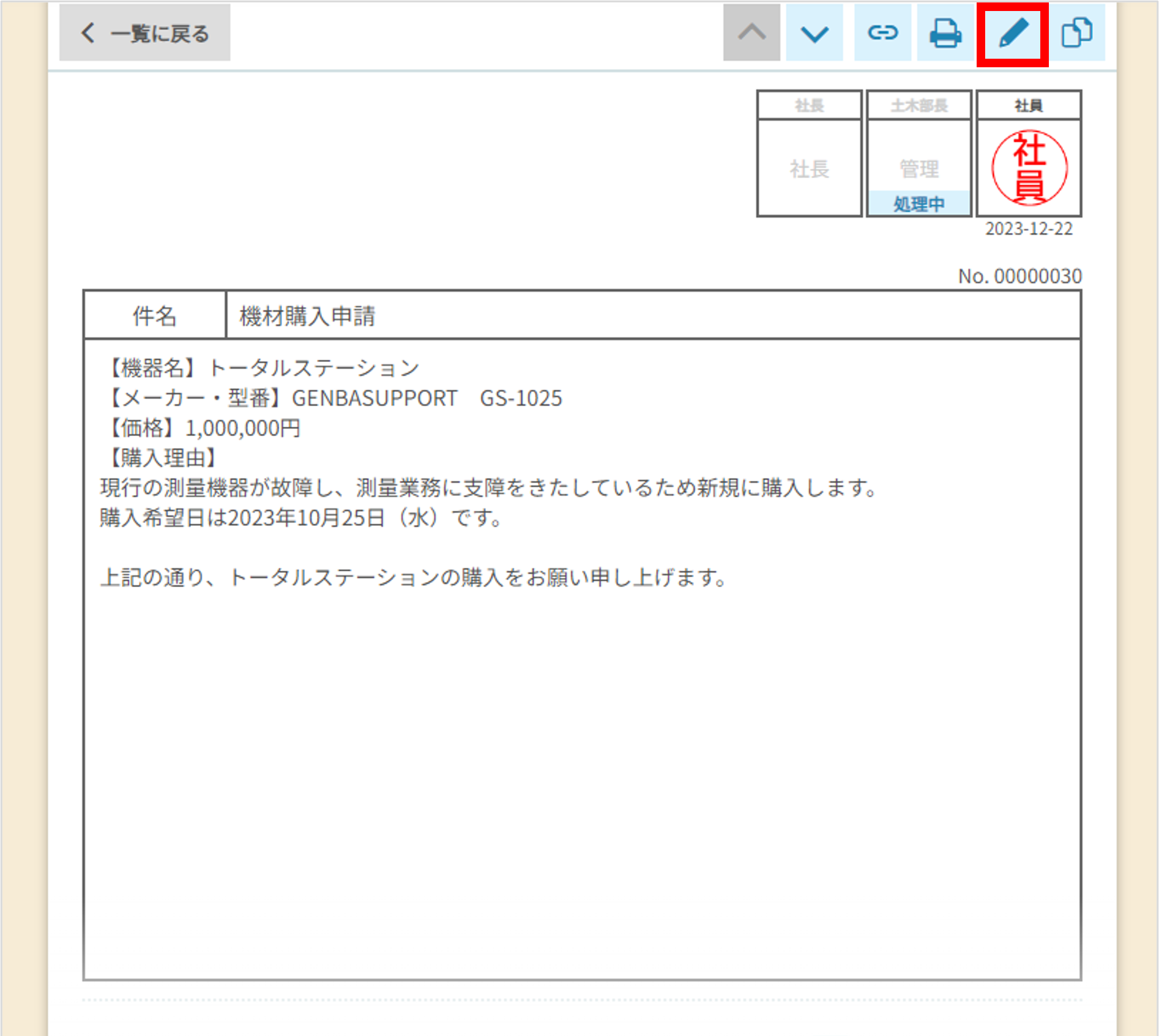 2.「取下げ完了」と表示されたら、右上の編集ボタンをクリックします。 |