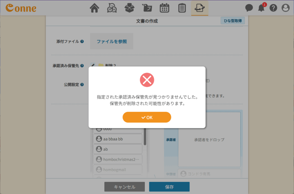 ワークフロー保存または申請時に、指定した承認済み保管先が削除されていた場合にメッセージが表示されます。