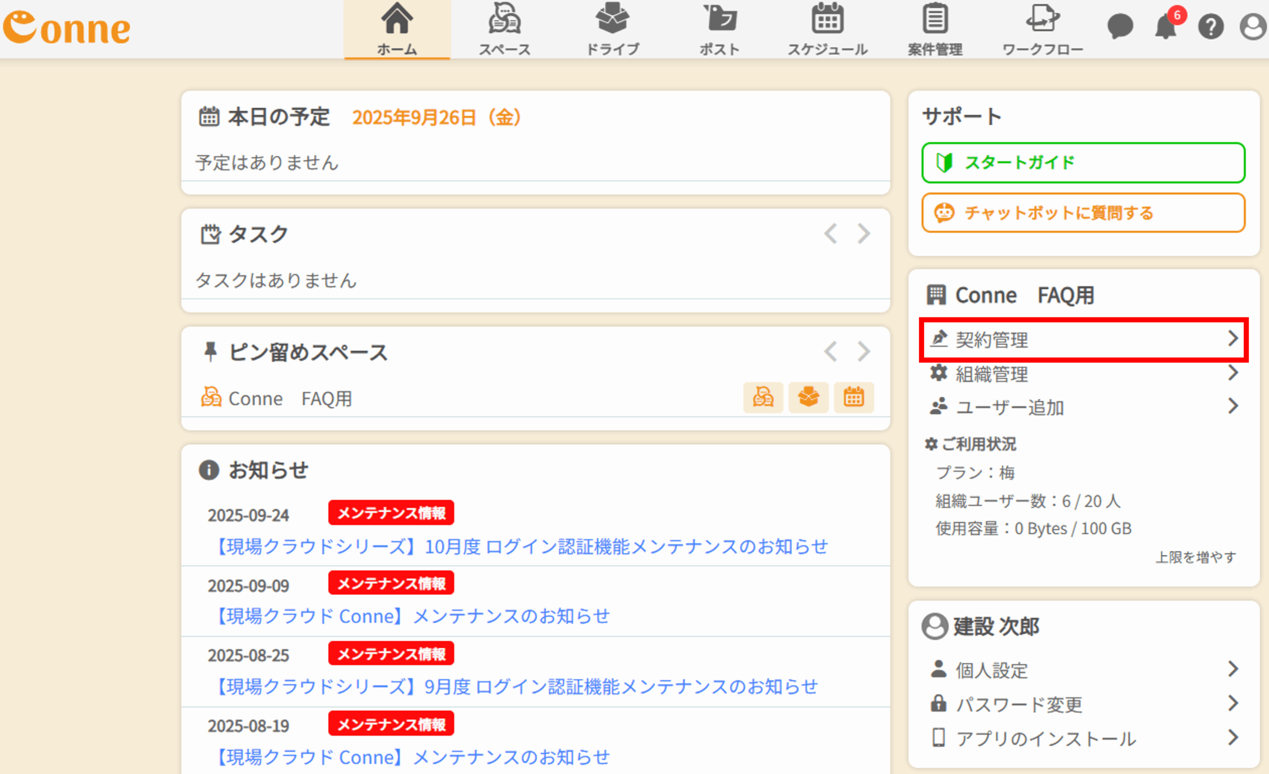 1.ホーム画面から、「契約管理」をクリックします。 |