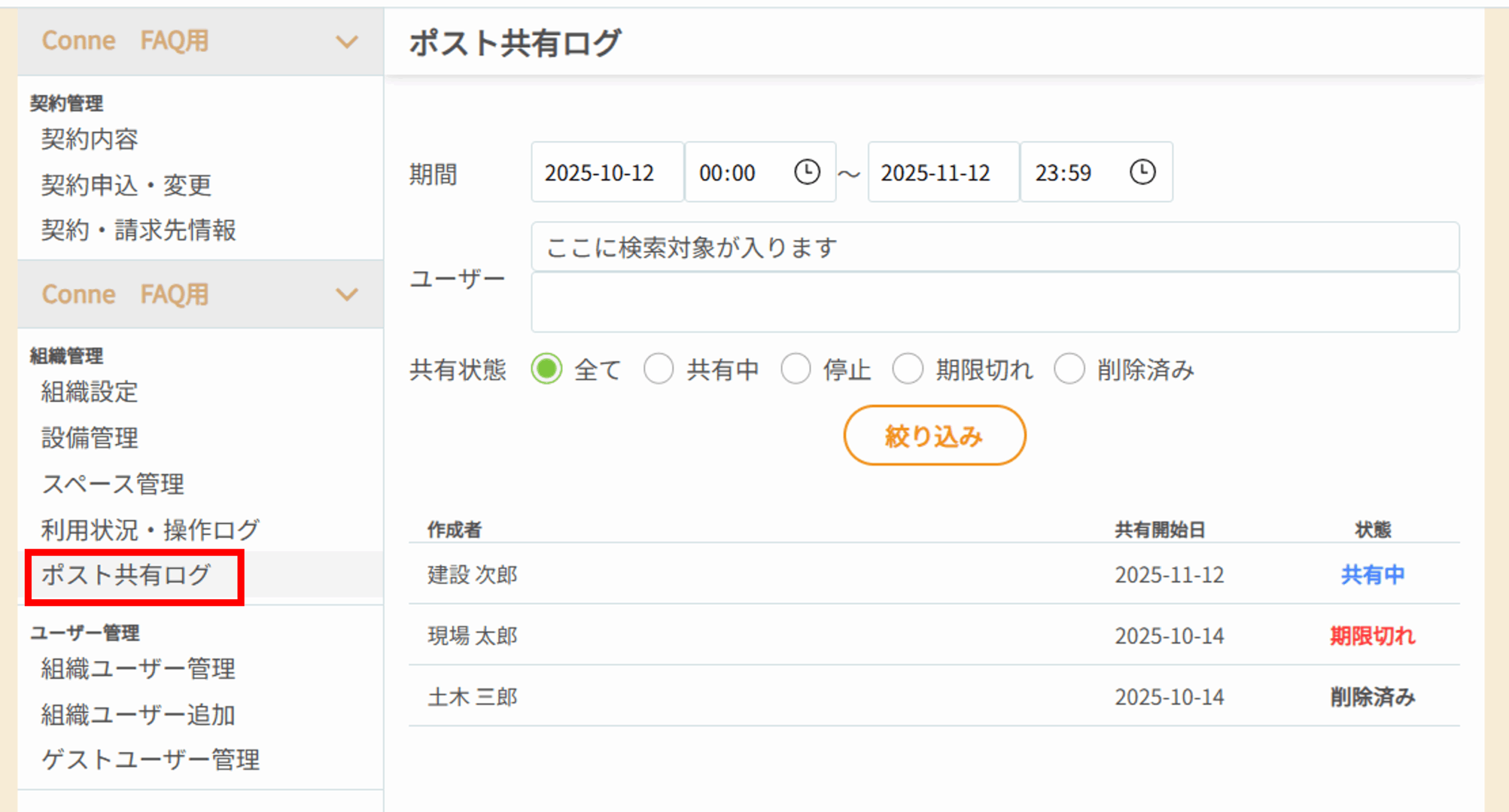 組織管理者は組織内のポスト機能の共有ログを確認できます。