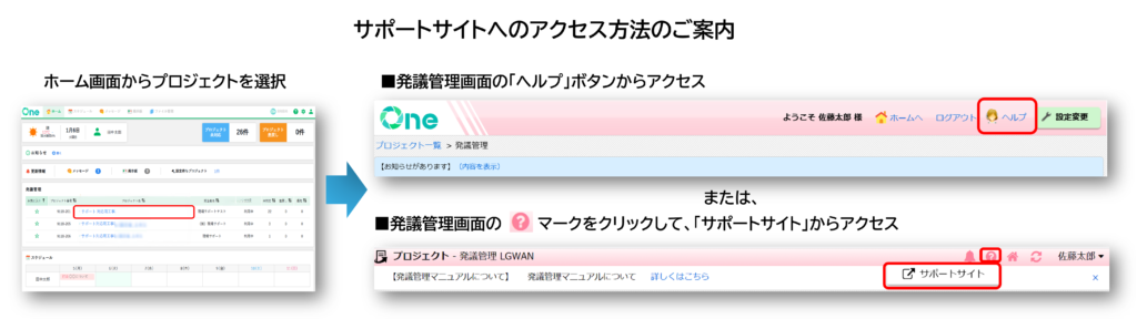 お客様のご利用環境に合わせたマニュアル・よくあるご質問をご確認いただくため、お手数ですがシステム画面内の「ヘルプ」または「サポートサイト」よりサポートサイトへアクセスしてください。