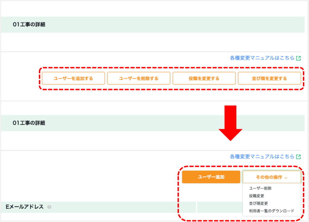 - プロジェクト詳細のユーザー一覧画面にて、操作性向上のため「ユーザー追加」以外の操作項目を「その他の操作」にまとめました。
