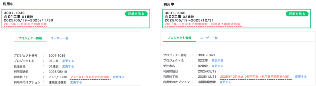 - プロジェクトの設定、詳細画面にて利用終了日が近いプロジェクトについては、利用終了月が表示されるようになりました。